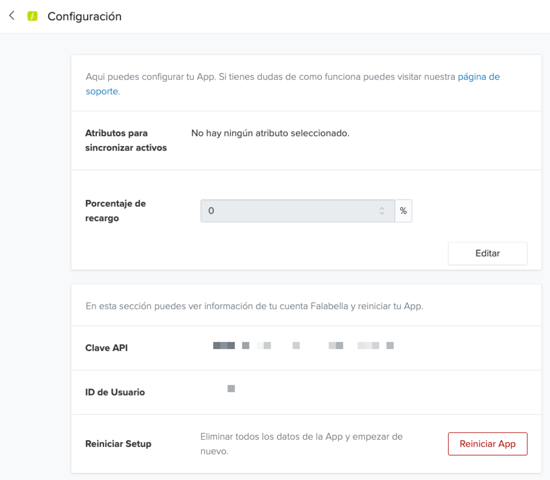 Instala la app de Falabella desde la galería de apps de Jumpseller. Configura tu API Key y User ID. Si los SKUs coinciden, la app sincronizará productos automáticamente.